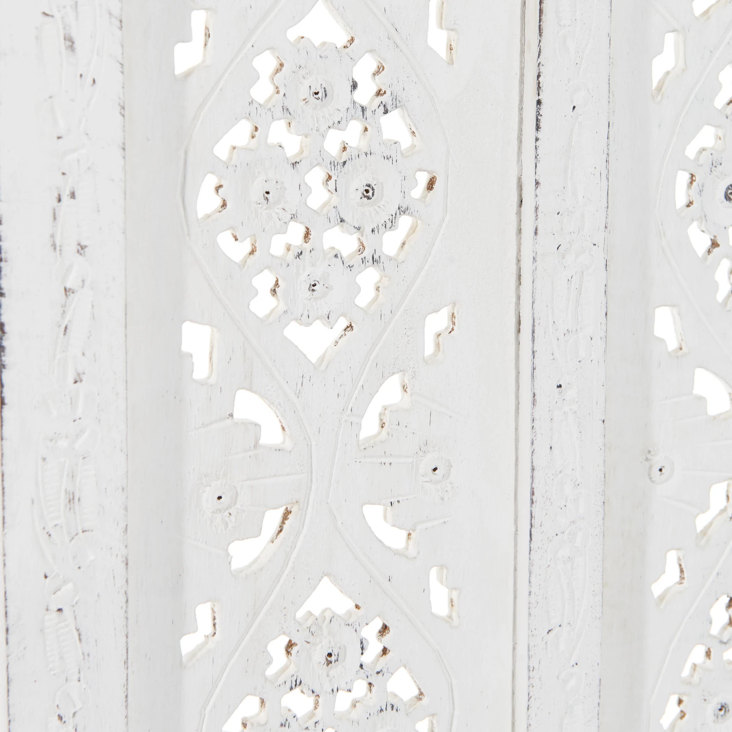 Als stamme er aus einer spanischen Finca, einer italienischen Villa oder einer portugiesischen Posada: Unser weißer Estella-Paravent mit femininen Ornamenten versehen, präsentiert sich charmant nostalgisch und aufwändig gearbeitet. Mit Liebe für das Detail. Denn er wurde von Hand gefertigt und bemalt. Ob als Raumteiler, als Sichtschutz oder Dekoelement: Der Paravent im Vintage-Look ist vielseitig nutzbar und weist deutliche Gebrauchsspuren auf.